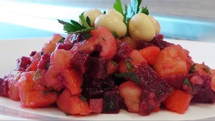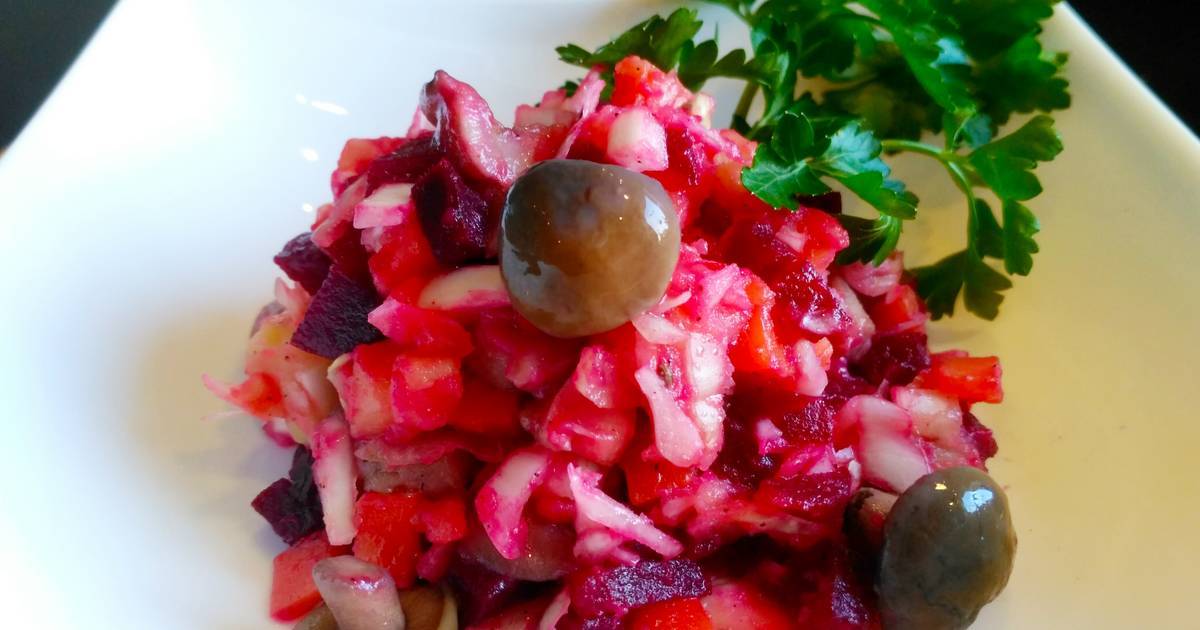 Существует великое множество рецептов винегрета. Несмотря на то, что салатик овощной, он достаточно сытный. К тому же, винегрет, благодаря разнообразию входящих в его состав овощей, весьма полезен для здоровья. Этот простой овощной салат пользуется заслуженной популярностью у людей, следящих за своей фигурой. Если традиционную фасоль исключим из состава продуктов, сможем понизить калорийность салата. Еще одной особенностью этого рецепта винегрета является отсутствие соленых (маринованных) огурцов, вместо которых пикантности блюду придадут маринованные грибы, в данном случае – шампиньоны.