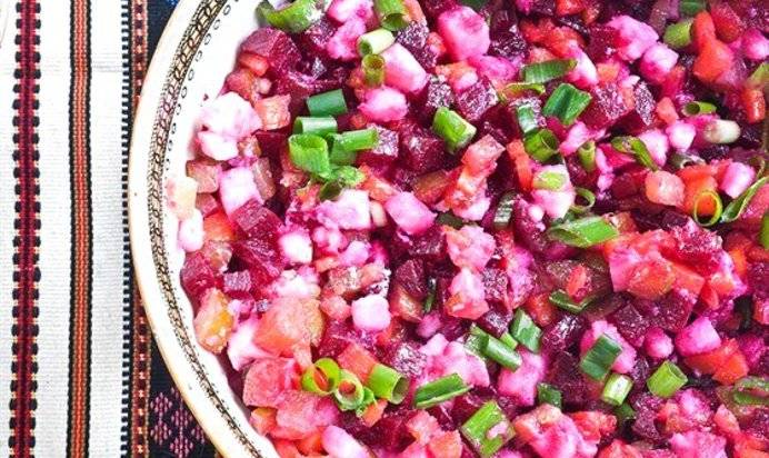 Правильно приготовленный винегрет внешне напоминает яркую цветную мозаику, он эстетичен сам по себе. Однако все же не мешает украсить его перед подачей к столу дополнительно. Для этого можно воспользоваться приведенными ниже идеями.