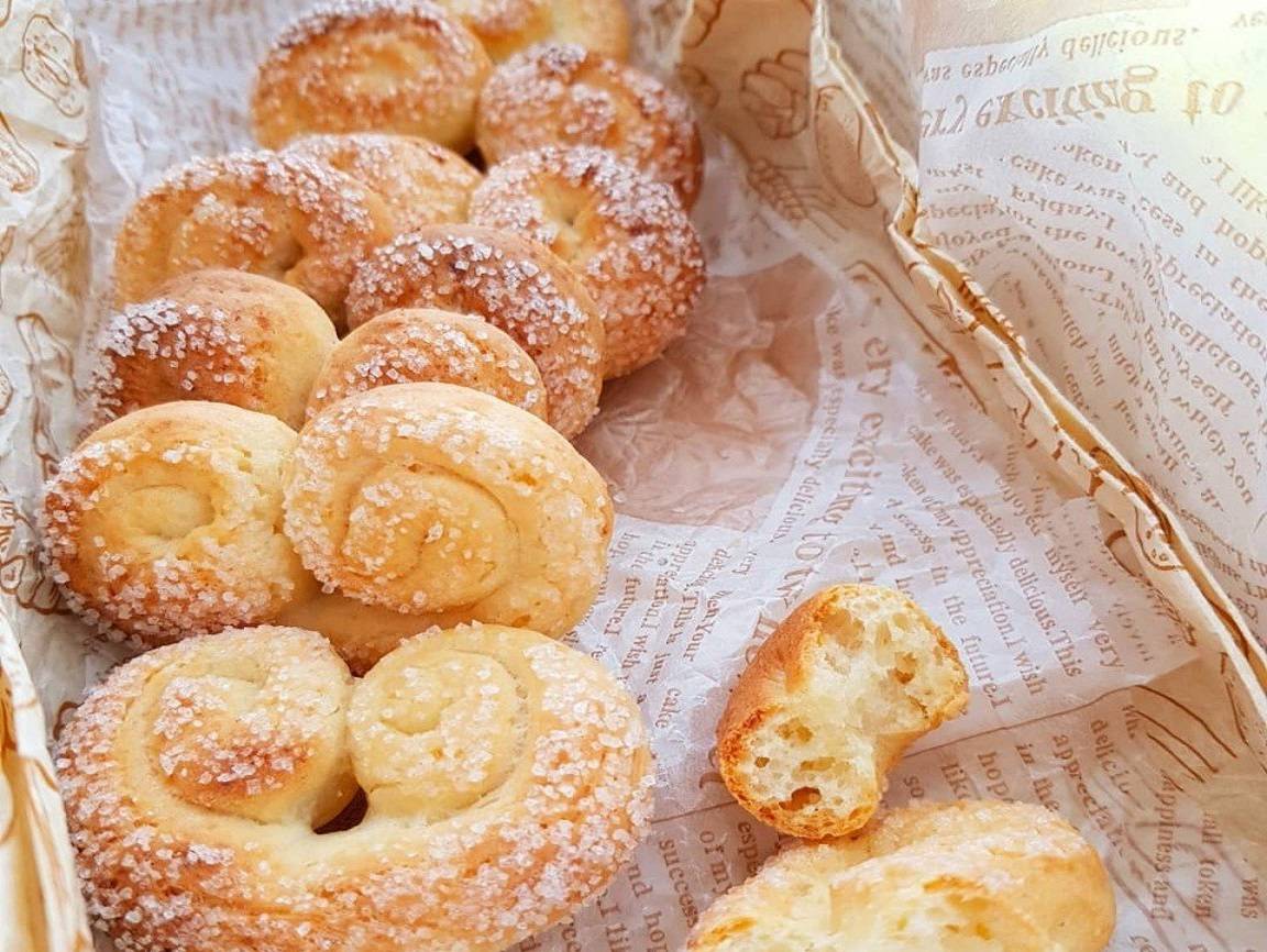 Стол посыпать мукой, раскатать толщиной примерно в пол сантиметра, стаканчиком вырезать кружки – это будет наше печенье. Сахар высыпать в емкость, кружки обмокать в сахаре, сложить кружок вдвое, сахар получиться внутри, опять в сахар со всех сторон. На противень постелить пергаментную бумагу и выкладывать на не большом расстоянии печенье.