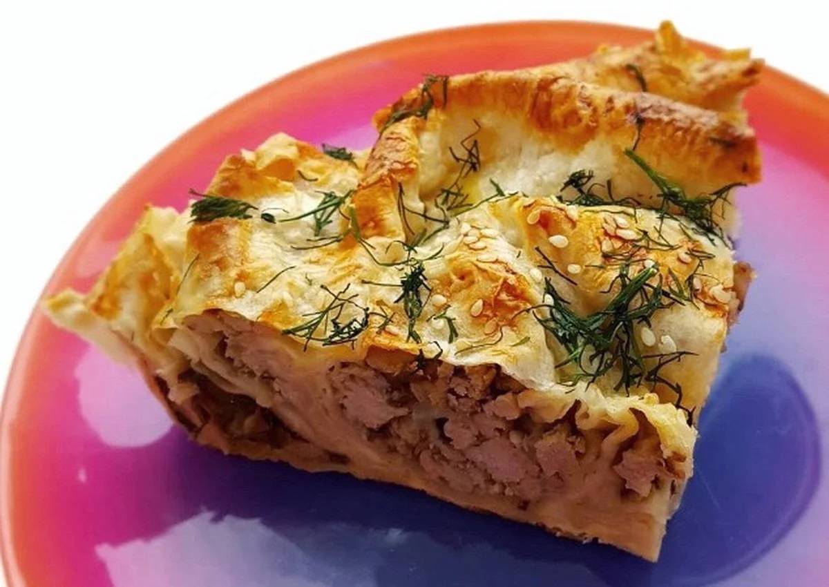 - Сверху равномерно уложить остатки начинки, прикрыть краями нижнего слоя.