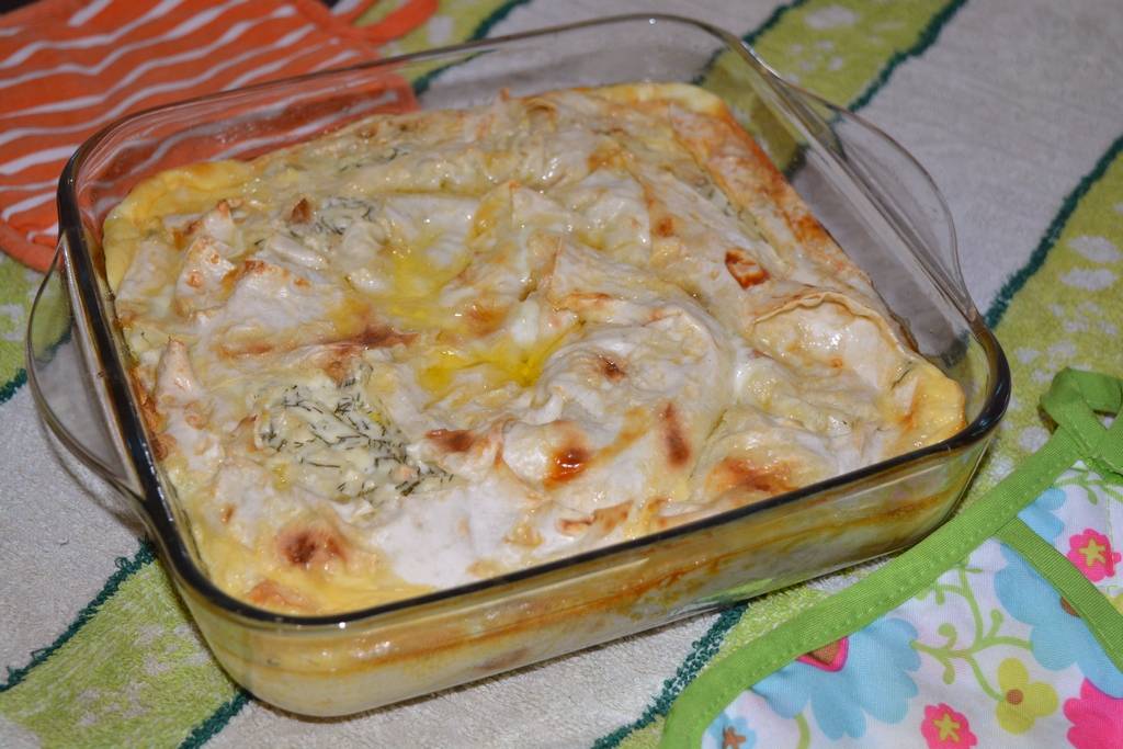 - К маложирной сметане добавляем тертый сыр, паприку, сухой чеснок, соль, нарубленную зелень укропа. Щедро промазываем соусом фаршированную грудку.