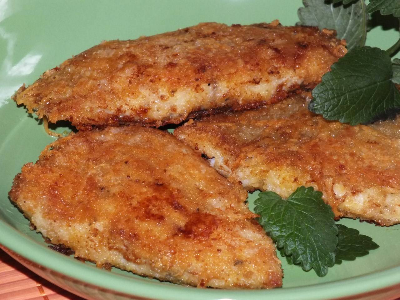 Этот рецепт можно видоизменить, приготовив вместо пряной панировки кляр из 1 яйца и 1 ст.л. муки. Жарить нужно также до золотистой корочки.