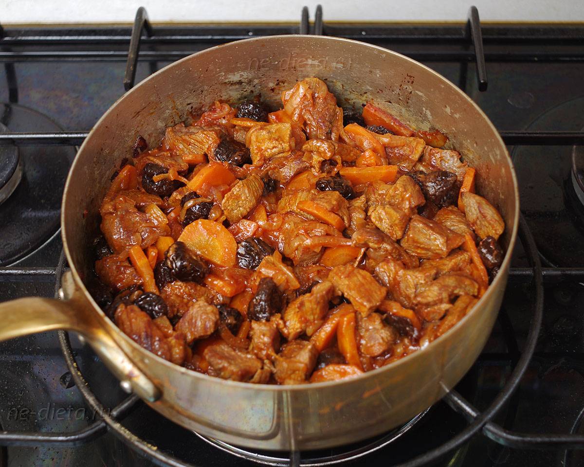 Морковь я добавляю после того, как мясо дойдет до полуготовности, чтобы она в готовом блюде осталась целыми кусочками.