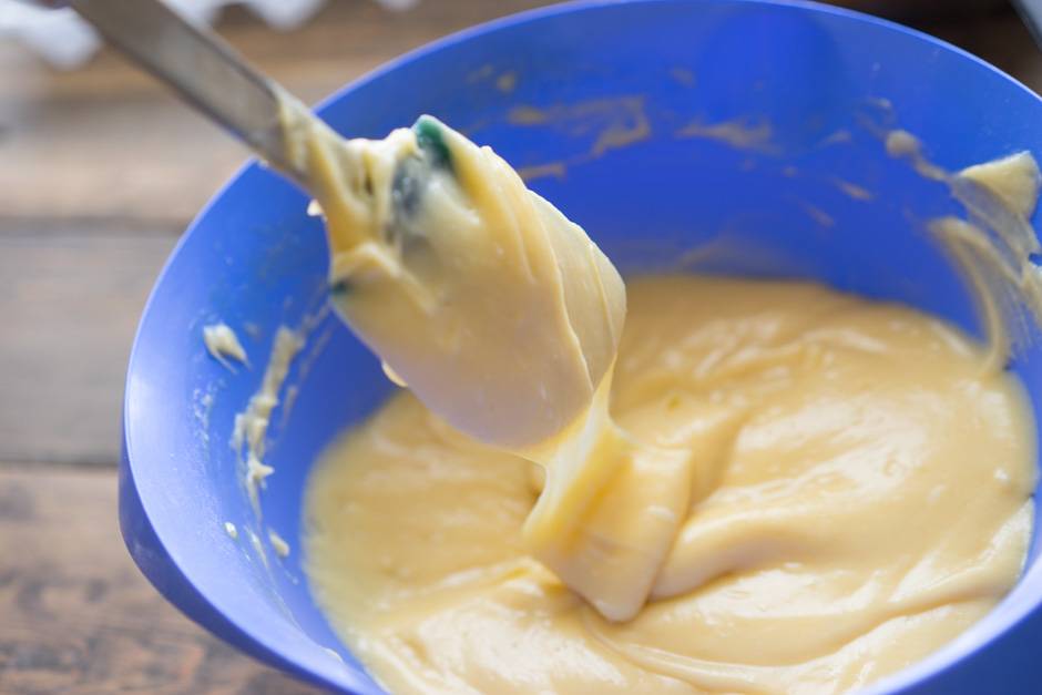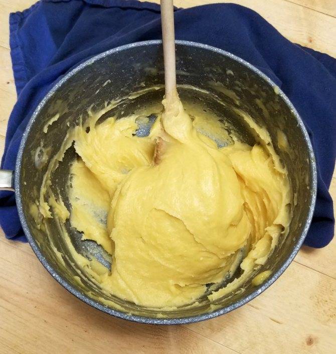 - Вбить яйца по одному, после каждого интенсивно помешивая. Получится блестящая однородная масса, сползающая с ложки тяжелой широкой лентой.