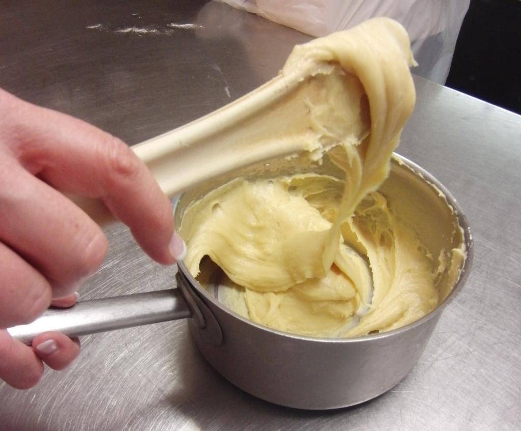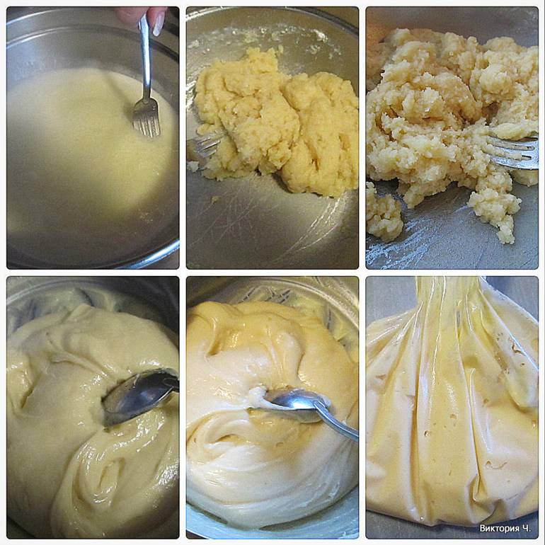 Способ приготовления. Наливаем в кастрюльку молоко, добавляем соль и нарезанное сливочное масло. Доводим до кипения. Всыпаем сразу всю муку. Прогреваем массу на слабом огне при постоянном помешивании, пока масса не соберётся в единый ком и начнёт легко отделяться от краев кастрюли. Снимаем кастрюлю с огня и даём горячему тесту остыть. Вводим по одному яйцу и втираем яйца в тесто. Должно получиться мягкое, не густое, но и не жидкое тесто.