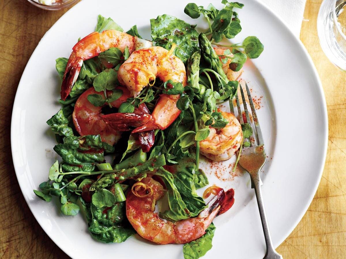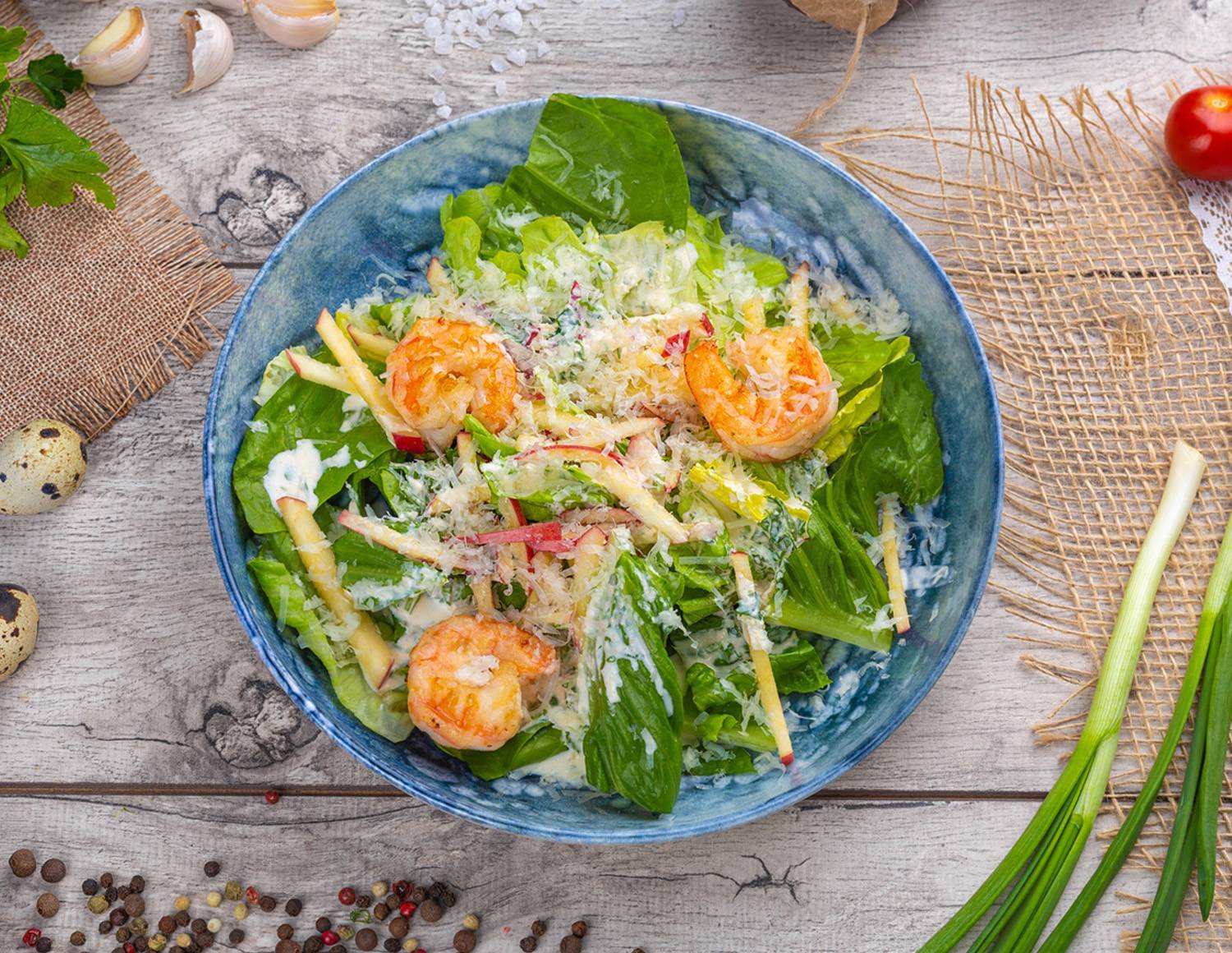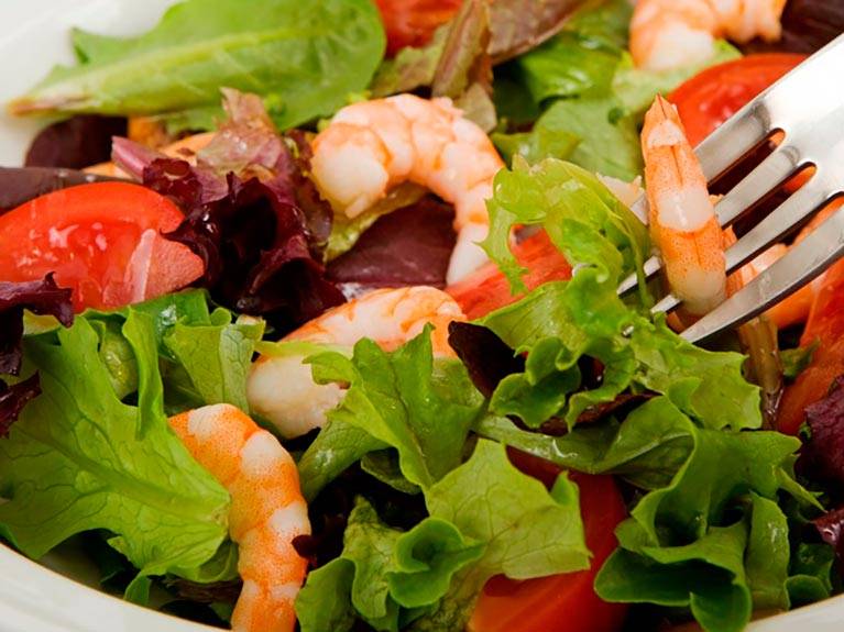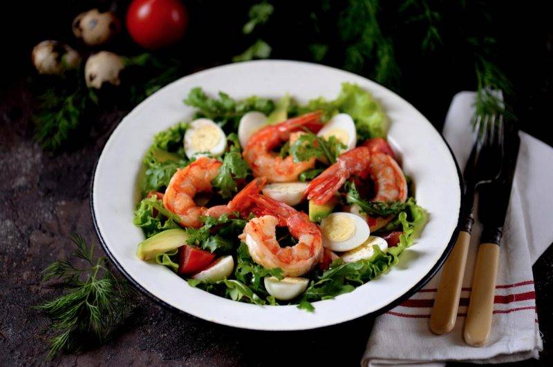 В составе данного салата королевские креветки, бесспорно, играют первую скрипку. Их сладковатый рыбный вкус прекрасно подчеркивается зеленью, сезонными овощами, оливковым маслом и соком лимона. Такой простой и полезный салат приятно разнообразит ваше меню.