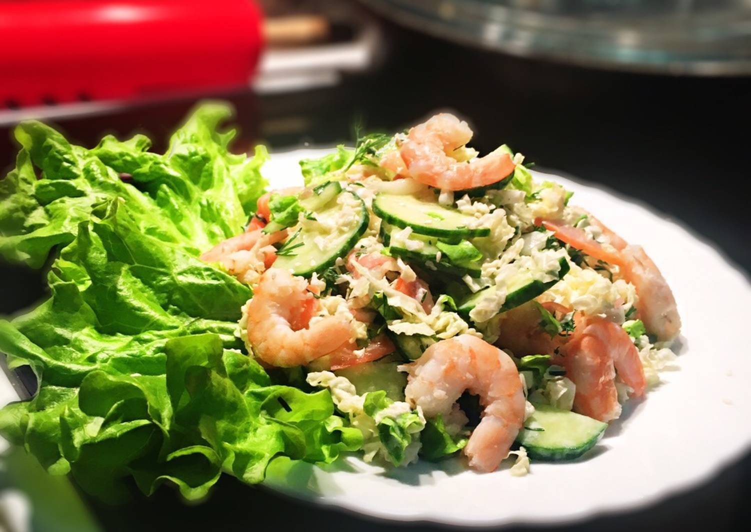 - Выложить салат на порционные тарелки и сверху поместить готовые креветки.