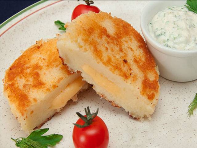 14. Перед подачей на стол, выложите картофельные зразы на блюдо и добавьте сметанно — чесночный соус.